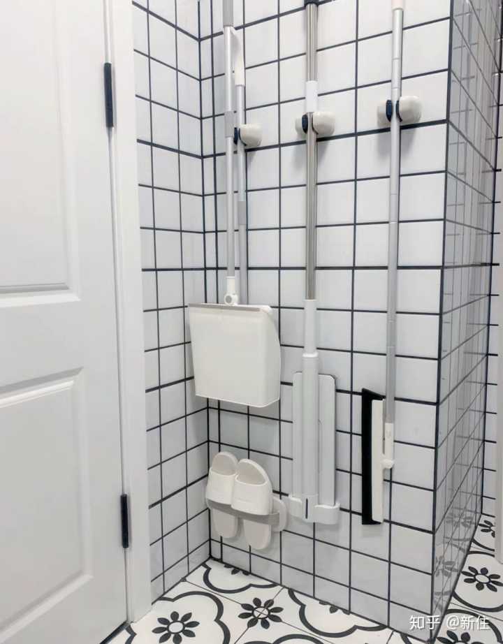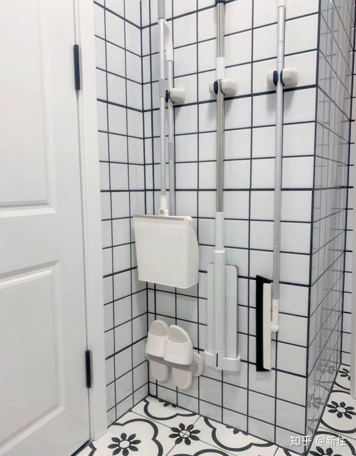 對(duì)于家里沒清潔工具柜,想要整潔也是有方法的,可以通過拖把掛鉤來壁掛在衛(wèi)生間門后收納。