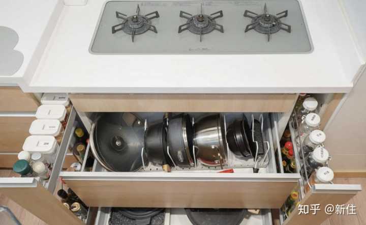 比如灶臺(tái)下做成大抽屜,收納家里各種鍋,兩側(cè)做成拉籃,正好可以放調(diào)料。