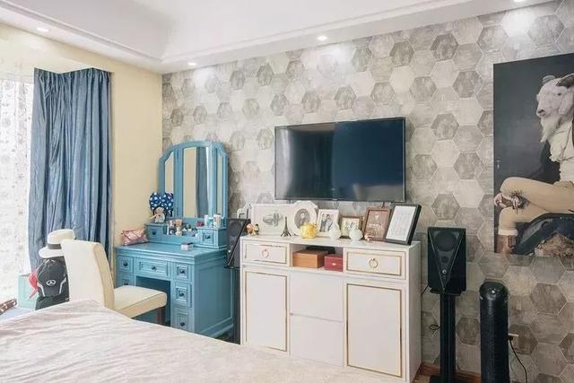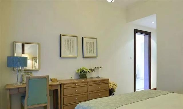 對(duì)于臥室面積較小,然后又想放兩個(gè)床頭柜的業(yè)主,不妨可以把梳妝臺(tái)放在電視墻,與電視柜平齊排放;